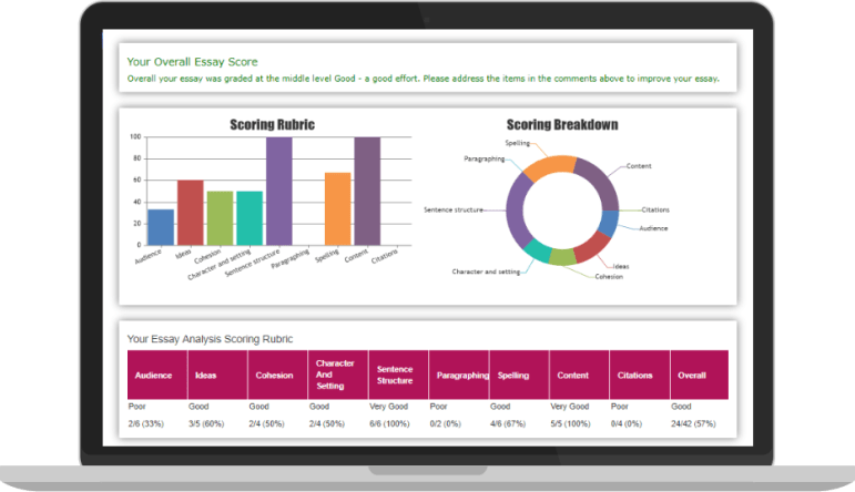 Our API-based grading engine uses Natural Language Processing tools and algorithms to analyse events within an essay. The customisable grading rubric then assigns a grade to more than 10 key marking points, such as Audience, Ideas, Cohesion, and Character & Setting.